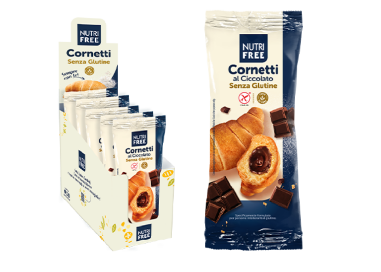 Il cornetto al cioccolato Nutrifree è preparata con un impasto soffice e fragrante e racchiude all’interno una delicata farcitura al cacao.