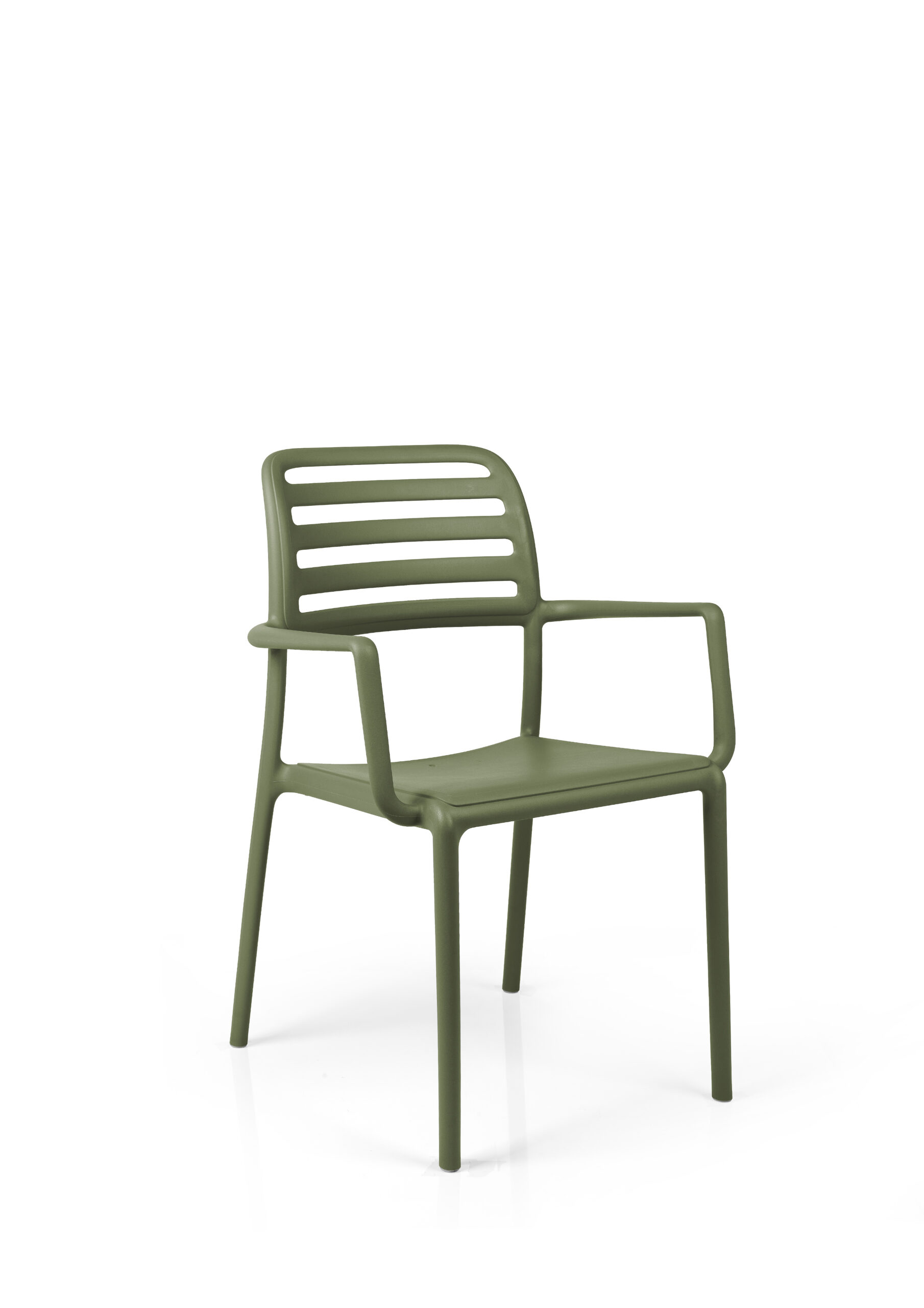Il design sobrio e pulito della sedia Costa è valorizzato dai braccioli integrati, che migliorano il comfort di seduta e aggiungono solidità alla struttura. Le linee orizzontali dello schienale e della seduta donano un ritmo moderno e arioso, mentre la finitura opaca agave richiama la freschezza del verde naturale, rendendola perfetta per chi cerca uno stile rilassante ma ricercato.