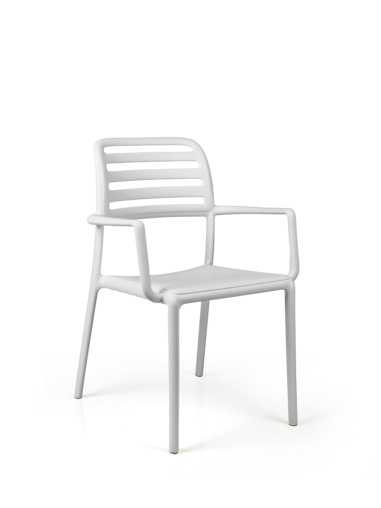 Linee essenziali, seduta comoda e schienale ergonomico: la sedia Costa è progettata per offrire relax in qualsiasi occasione. Il bianco lucido ne esalta le forme, donando un tocco di freschezza e luminosità agli spazi esterni. I braccioli aumentano il comfort e la rendono adatta anche per pranzi lunghi o momenti conviviali.
