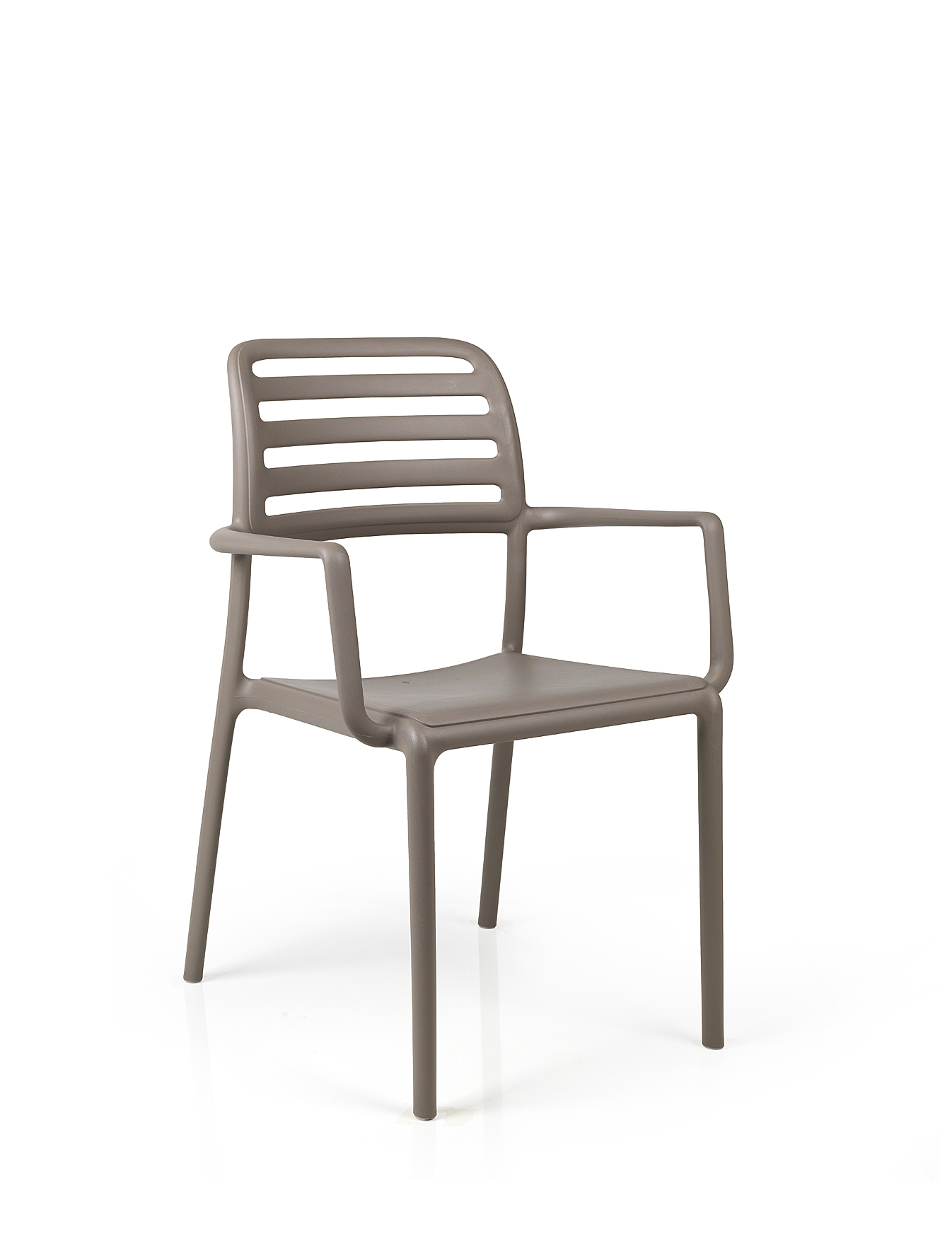 Sedia monoblocco con braccioli. Materiale: polipropilene fiberglass trattato anti-UV e colorato in massa. Finitura opaca. Dotata di piedini antiscivolo. Resina riciclabile.